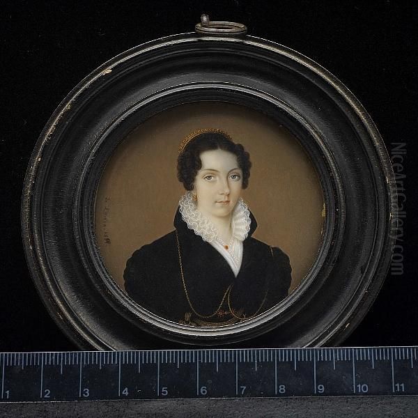 A Lady, Wearing Black Dress, The Bodice Hung With Gold Chains, The Sash Held With Coral Set Gold Clasp, White Chemise With Lace Standing Collar And Jewelled Pin, Gold Earrings, Her Hair Upswept And Curled At The Temples, With A Gold And Jewelled Diadem.