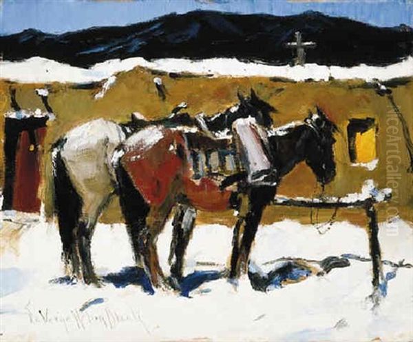 Bring the timeless beauty of Laverne Nelson Black's Two Horses Saddled into your home with a handmade oil painting reproduction. Carefully recreated on canvas by skilled artists using traditional techniques, this piece captures the delicate brushwork, subtle light, and vibrant color of the original masterpiece. With museum-level quality and rich texture, it brings elegance and artistic depth to any space. Enjoy free shipping and make this masterpiece a part of your personal collection.