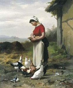 Gehoft Mit Magd Beim Futtern Des Geflugels Oil Painting by Lazar Mikhajlowitsch Diamant