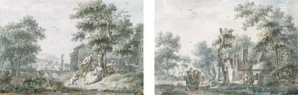 A Fisherman And Other Figures Resting By A Tree, A View Of A Citybeyond; And Peasants Outside A Farmstead Among Trees, A Figure Withhorse And Wagon On A Path Nearby