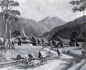 Figures With A Prao In Front Of A Minankabau Village In Sumatera