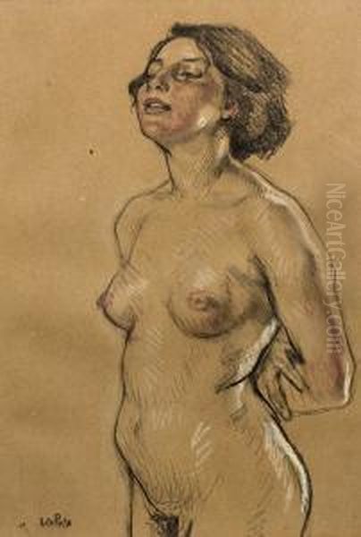 Auf Grostenteils Frei Gelassenem, Die Bildwirkung Bestimmenden Grund Komponierter Akt, Dessen Korper Mit Kraftig Umreisenden Strichen, Akzentuierenden, Sich Verdichtenden Strichlagen, Schraffuren Und Lavierungen Modelliert Wird. Impressionistische