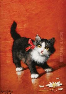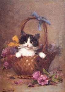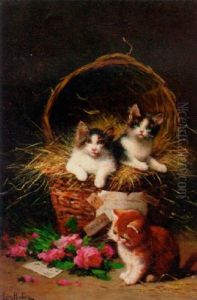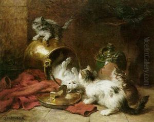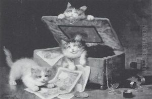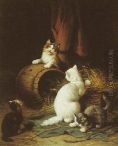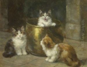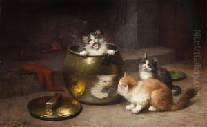Spielende Katzen Vor Dem Kamin, Eine Im Messingkessel Sitzend