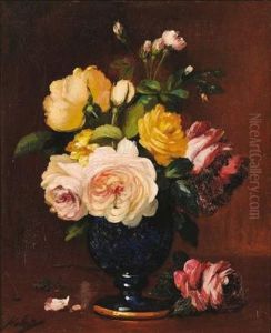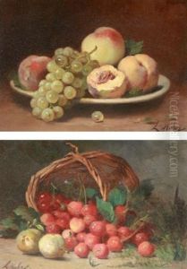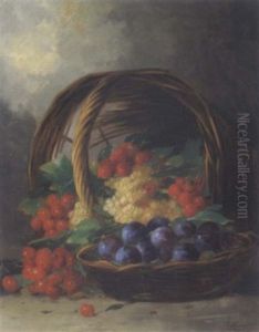 Plums In A Basket, Strawberies On A Plate, A Wine Glass And A Pewter Jug On A Table