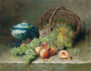 A Basket Of Grapes With Strawberries, Peaches And Pears