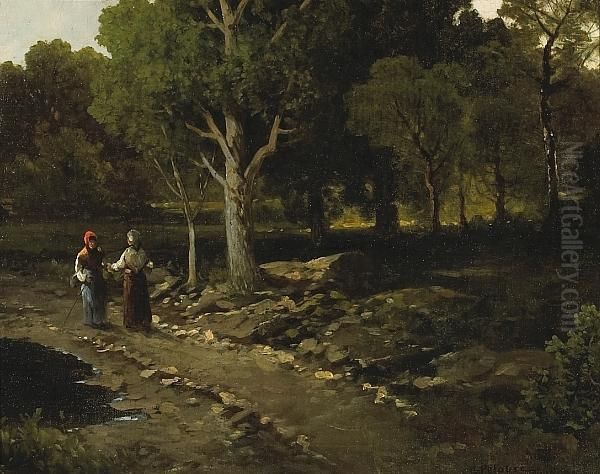 Two Figures On A Path In A Wooded Landscape