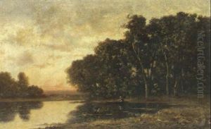 A Wooded River Landscape With A Peasantwoman By A Pond At Sunset