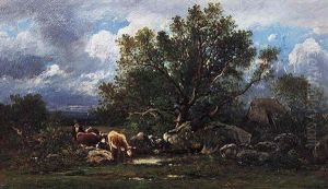 Sommerliche Wiesenlandschaft Mit Eichengruppe, Rechts Davon Hirte Mit Schafen