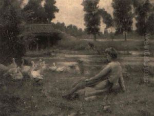 Deux Paysans Au Bord De La Riviere Pres D'une Ferme
