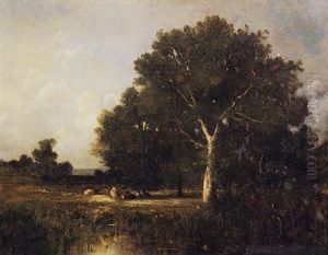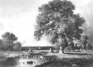 Sommerliche Wiesenlandschaft Mit Eichengruppe, Rechts Davon Hirte Mit Schafen