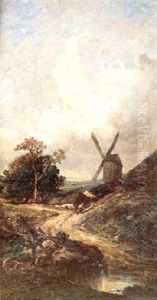 Paisaje De Los Paises Bajos Al Atardecer Con Lavanderas, Molinos Y Animales