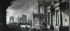 An Architectural Capriccio Of A Harbour With A Moored Boat And Stevedore's [&] Peasants Among The Portico..