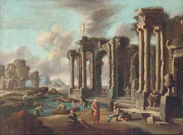 A capriccio of Roman ruins with travellers