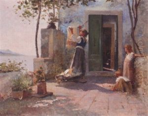 Waschermadel Am Brunnen, Im Hintergrund Eine Sudliche Meereslandschaft