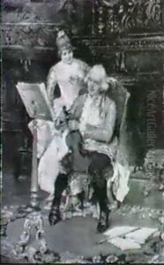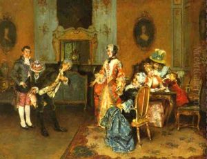 Parlor Scene With Ladies And Gentleman Dancing And Gossiping