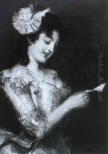 Portrat Einer Jungen Frau In Lachsfarbenem, Mit Tull Und Spitzen Besetztem Seidenkleid...
