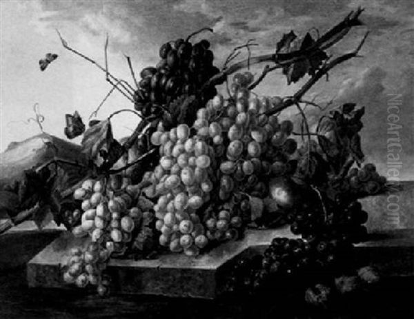 Groses Stilleben Mit Trauben, Pfirsichen Und Nussen Vor Einer Landschaft