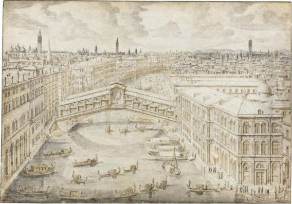 A View Of The Grand Canal And The Rialto Bridge, Venice, With Many Small Boats In The Foreground