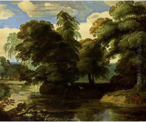 A Wooded Landscape With A Sportsman Shooting Ducks Near A Stream