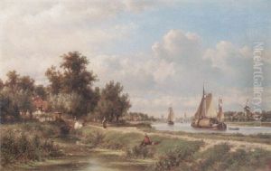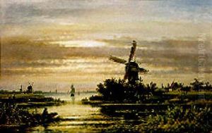 A Wooded Riverlandscape With Figures Conversing And A Boat On A Canal With A Windmill Beyond