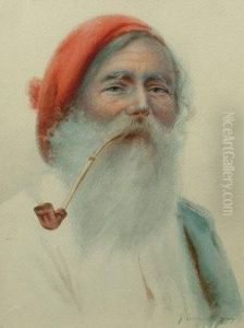Portrait Of An Oriental, Head And Shoulders, Wearing A Bejewelled Blue Hat And A Red Fur-Trimmed Coat