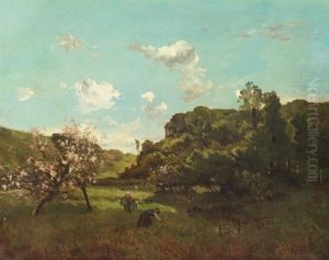 Fruhlingslandschaft Mit Bluhenden Apfelbaumen Und Figurenstaffage