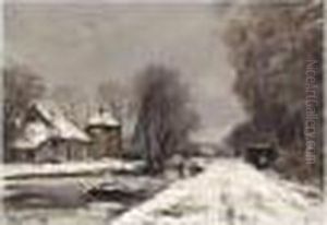 A Winter Landscape With Farm Houses Along A Waterway
