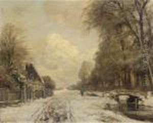 A Winter Landscape With A Figure Walking Along A Canal