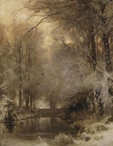 A Snow Covered Forest With Fair Wagons And A Horse Along A Path