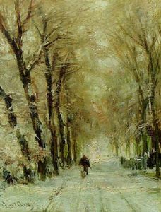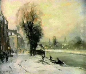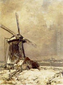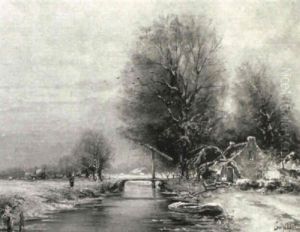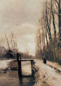 A Peasant On A Bridge In A Snow-covered Polder Landscape