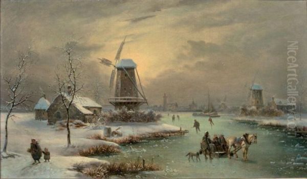 Chariot Et Patineurs Sur Une Riviere Gelee