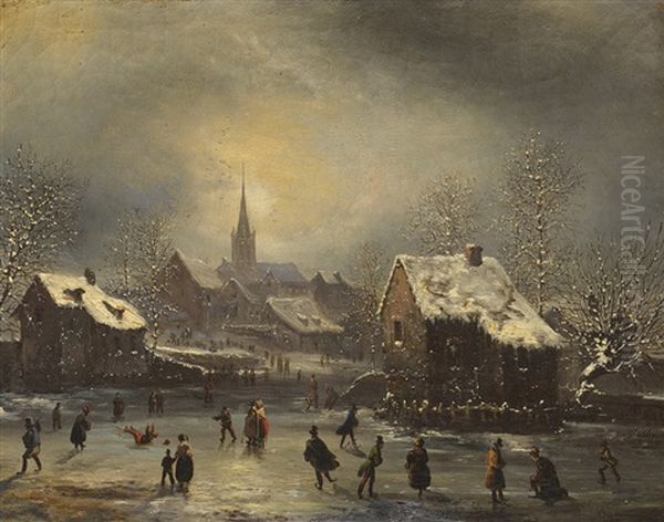 Scene De Patinage Aux Abords D"un Village