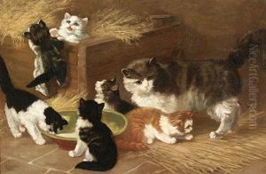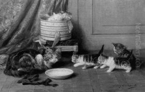 Gatitos Jugando Sobre Una Mera Con Cesto De Mimbre Y Botella