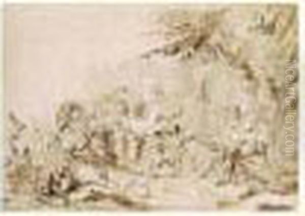 Scene De Bacchanale : A Gauche Des Faunes Enleve Une Femme ; A Droite, Au Dessus D'un Enchevetrement De Corps, Des Faunes Attirent Une Femme Sur Un Tertre.