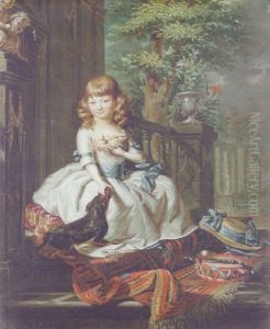 Portrait Of A Girl Seated On The Steps Of A Terrace, A Formal Garden Beyond