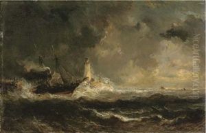 Vor Klippenufer Mit Leuchtturm Kenterndes Segelschiff