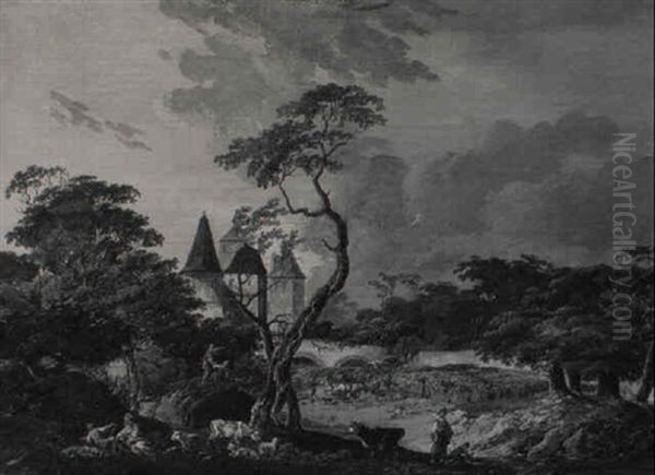 A Wooded River Landscape With Herdsmen And Cattle By A Castle
