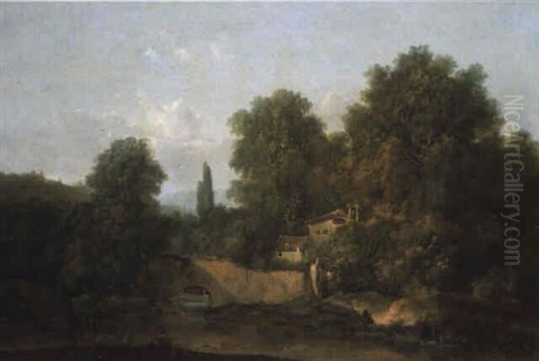 Paysage Avec Un Pecheur Au Bord D'une Riviere Oil Painting by Louis Gabriel Moreau