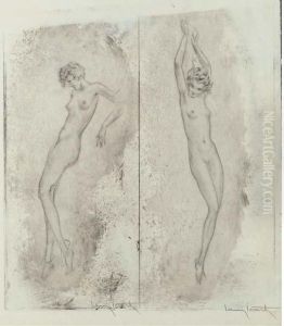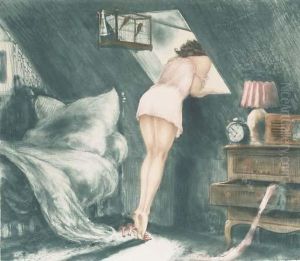 Partially Robed Woman In Hall And Woman Crying On Bed: Two Works
