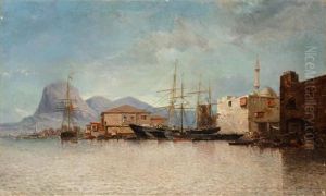 Des Cavaliers Dans Un Port Oriental, Une Armada En Arriere Plan