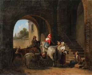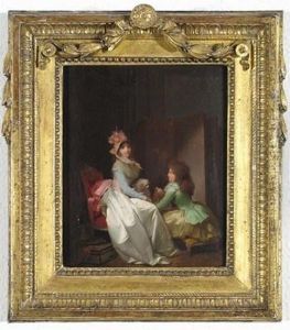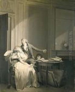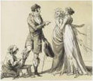Elegant Interior With A Young Man Conversing With An Old Woman Accompanied By A Courtesan