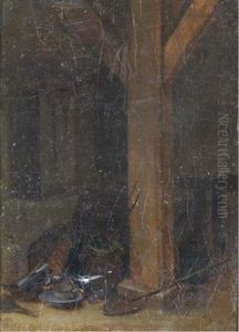 A Terracotta Urn, A Copper Basin, A Spade, A Tea Cup, Ceramic Plates And A Water Jug, Set In A Barn Interior
