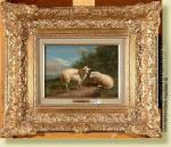 Huilesur Panneau D'acajou "moutons Au Pre".