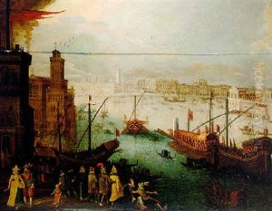 Townsfolk At A Market By A Statue Of The Goddess Diana, A Quay Beyond