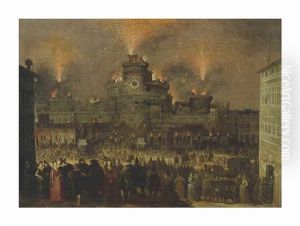 A Firework Display At The Castel Sant'angelo, Rome Oil Painting - Louis de Caullery