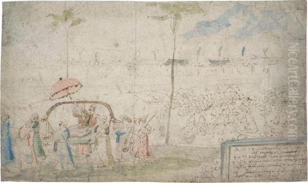 An Oriental Dignitary Being Carried In A Litter, A Military Camp Beyond