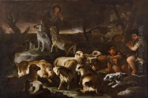 Un Pastore E Due Pastorelli Tra Armenti, In Un Paesaggio Agreste All""""alba