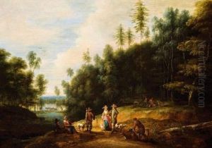 A Wooded Dune Landscape With Travellers And Dogs Resting Near A Path Together With A Horseman, And A Shepherd With His Flock, With A View Of A Village Beyond