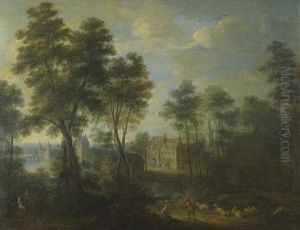 A Wooded Landscape With A Shepherd And His Flock On A Country Path