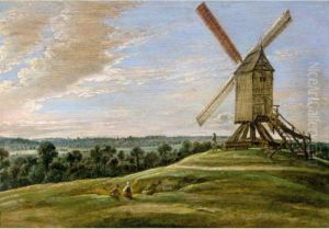 An Extensive Landscape With Shepherds And Their Flocks Beside A Windmill